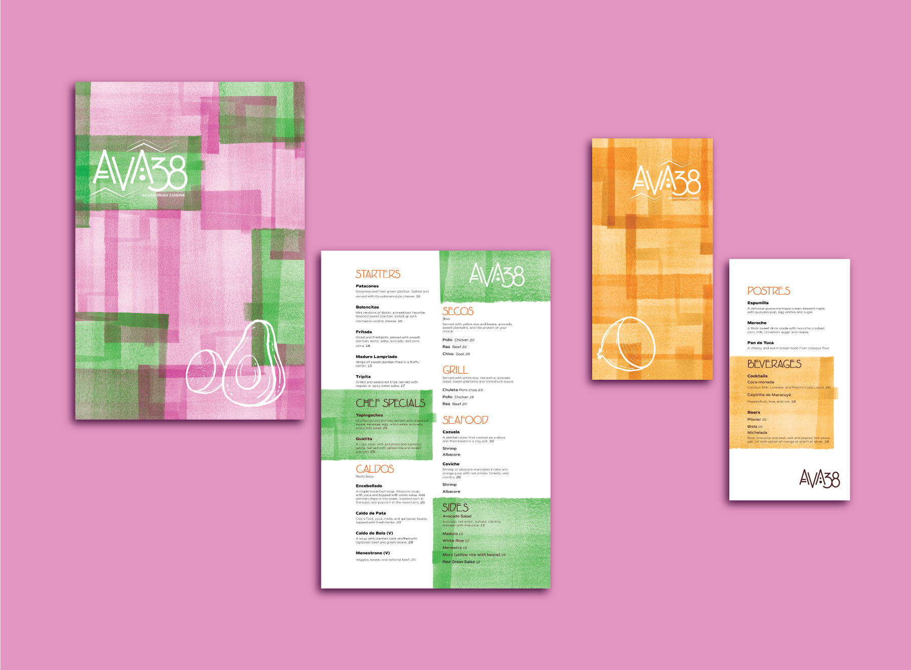 Offering traditional food from various Ecuadorian provinces, AVA 38 serves fresh and colorful dishes that will brighten your day or even remind you of home. Owner Vicenta Castro grew up on 38th Avenue in Guayaquil, Ecuador; where foot and car traffic hardly died and a variety of restaurants opened shop everyday. AVA 38 captures Ecuadorian cuisine as colorful, vibrant, and diverse. With this project, I tried to stray away from older, traditional takes on Ecuadorian themed restaurants and went for a bright and modern twist. Colors and textures are based on the staple ingredients found throughout the array of dishes: plantain, lime, red onion, and avocado.