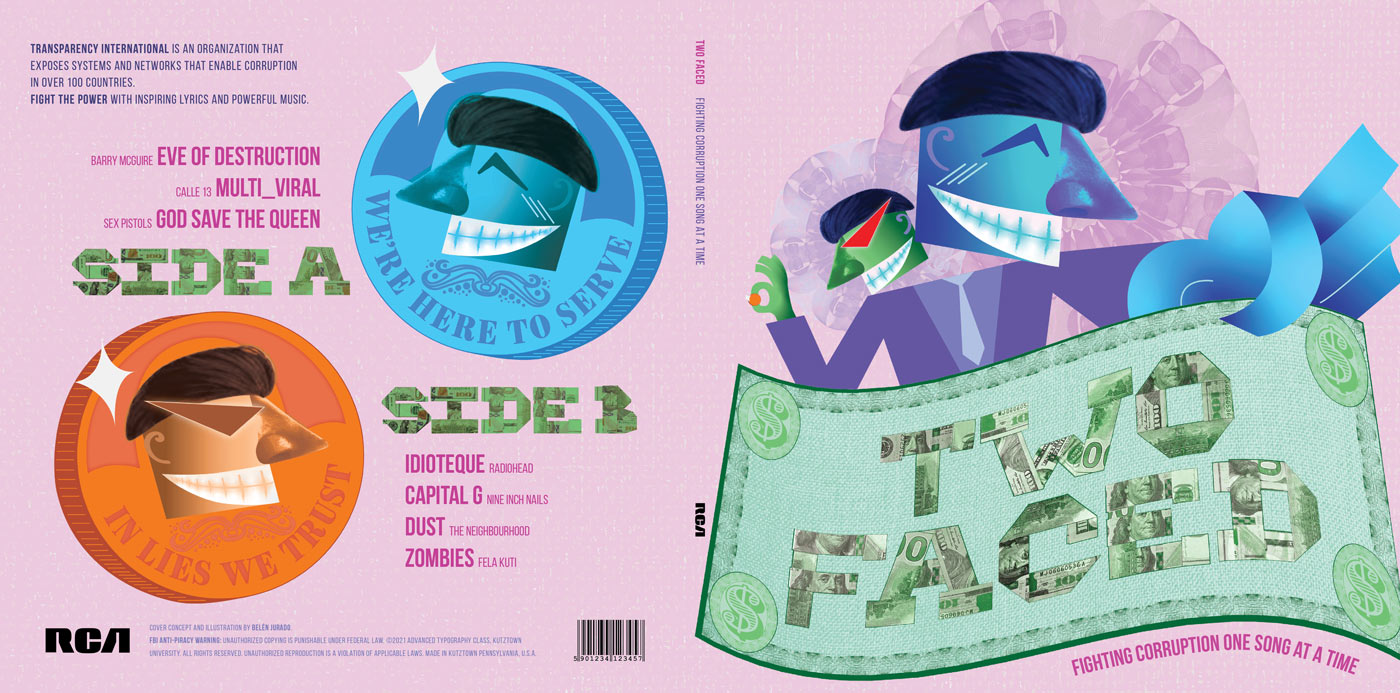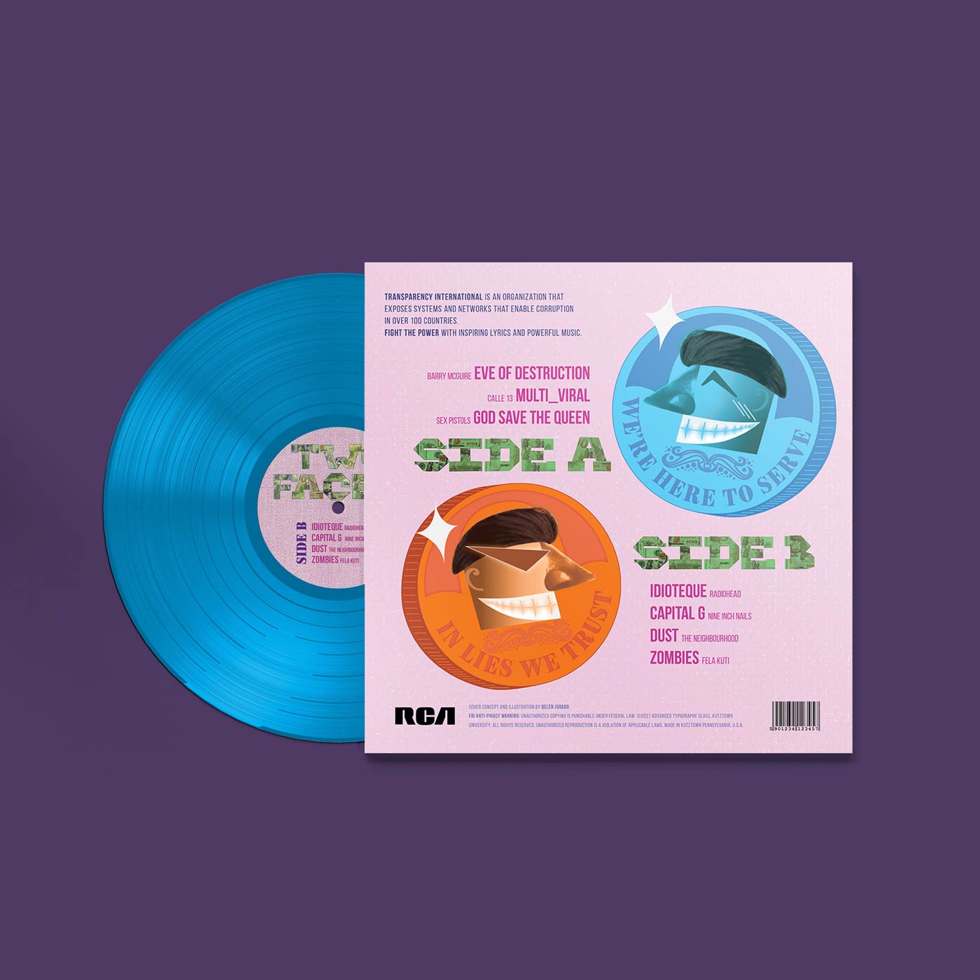 Transparency International fights to expose and bring down corrupt politicians and governments in over 180 countries around the world. To fund this mission, supporters are able to purchase TWO-FACED, a vinyl that will fight corruption one song at a time, or the merchandise based off the vinyl design.