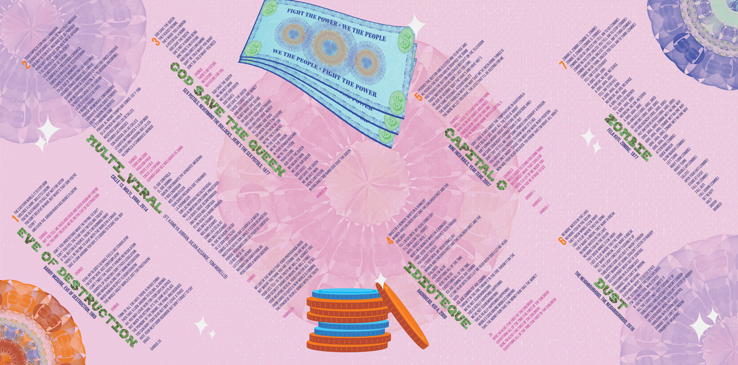For this project, I was inspired by artwork and patterns found on actual currency to depict two-faced politicians. I also created my own "money font" by repeatedly folding the same three 100 dollar bills into each letter of the alphabet. The songs are great, too; take a listen below as you scroll.